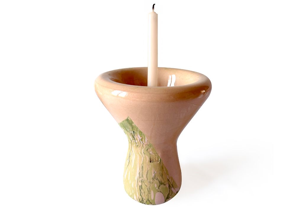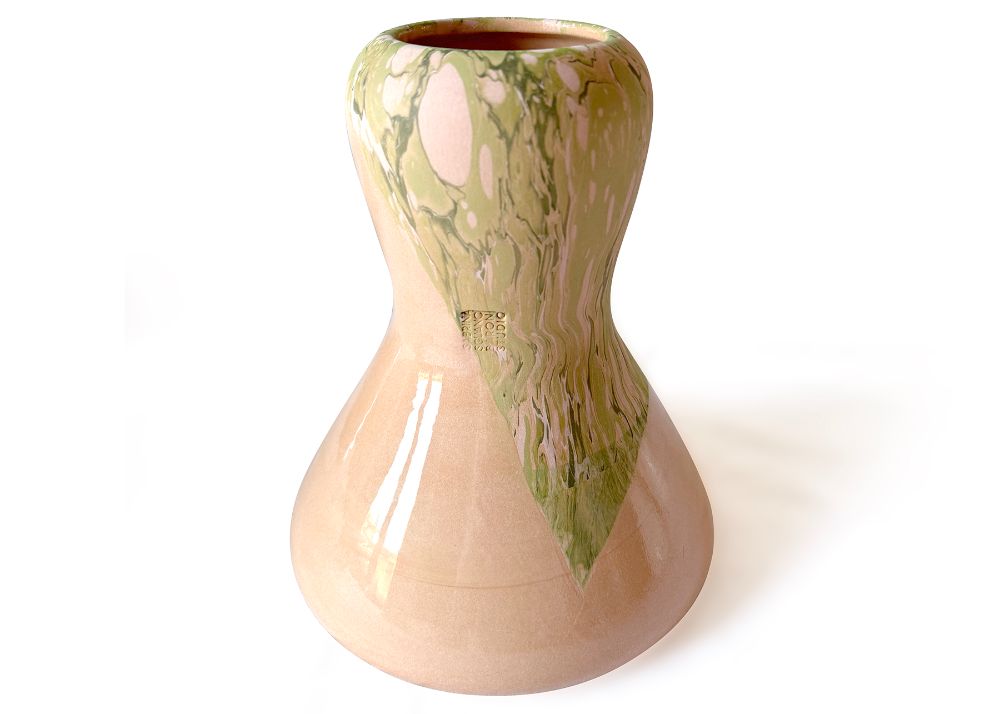 VCH-GM - At once a vase and a candle or fragrance holder, Fluid sits at the intersection of design and craftsmanship. Made using the traditional slip-casting of red earthenware in plaster molds, its rounded form draws inspiration from the ancient gestures of marbling, highlighting both the fluidity of the decoration and the porous nature of ceramics. The tonal green patterns on terracotta are created through a marbling technique, using water-based pigments with an algae solution, alternated with areas glazed in a glossy transparent finish. Each piece is unique, with natural variations occurring within the decorative family shown.
