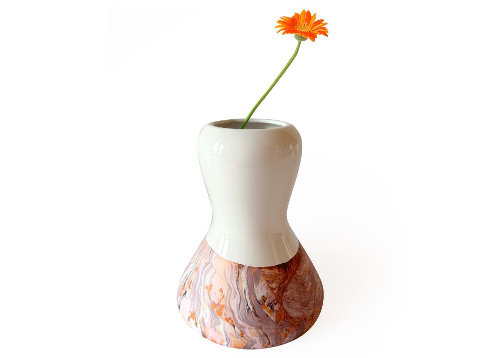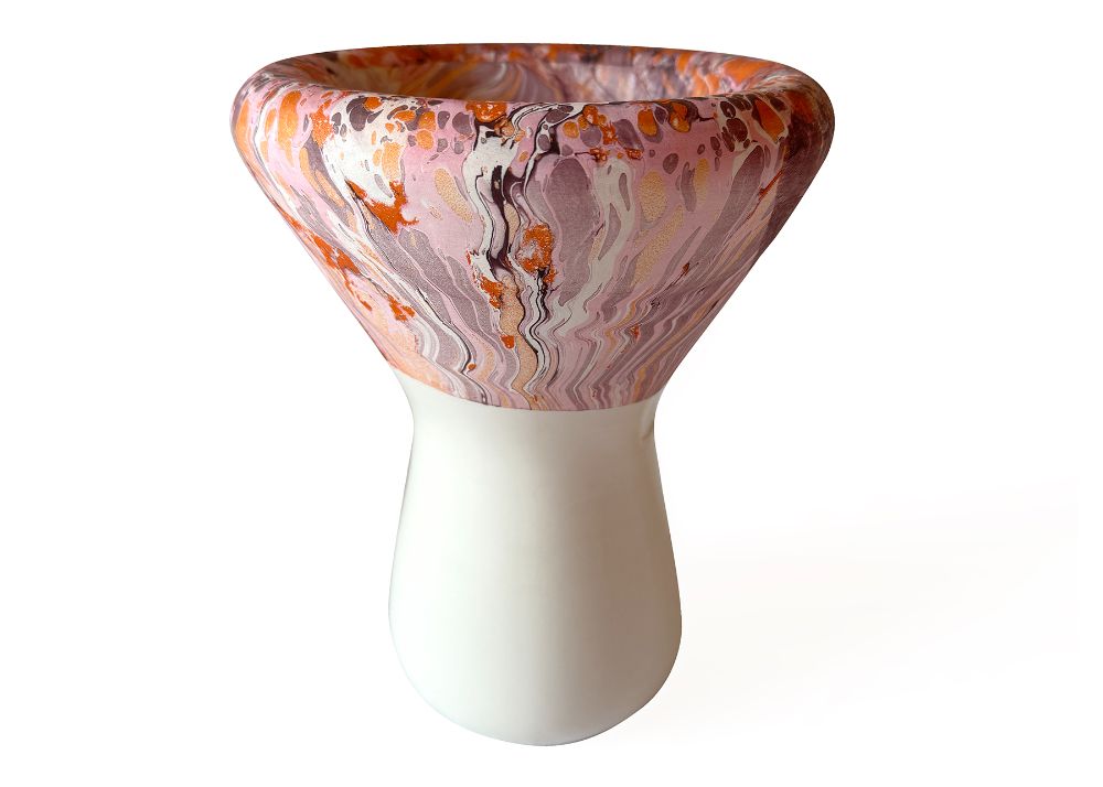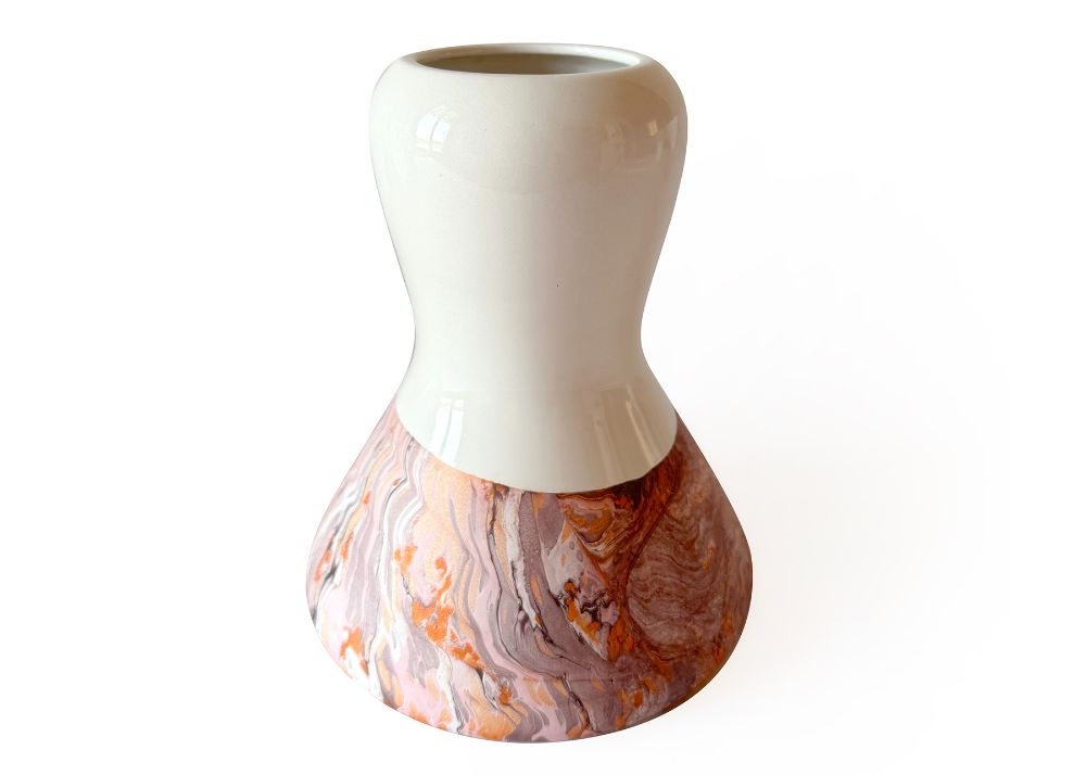 VCH-RW - At once a vase and a candle or fragrance holder, Fluid sits at the intersection of design and craftsmanship. Made using the traditional slip-casting of white earthenware in plaster molds, its rounded form draws inspiration from the ancient gestures of marbling, highlighting both the fluidity of the decoration and the porous nature of ceramics. The tonal green patterns on terracotta are created through a marbling technique, using water-based pigments with an algae solution, alternated with areas glazed in a glossy transparent finish. Each piece is unique, with natural variations occurring within the decorative family shown.