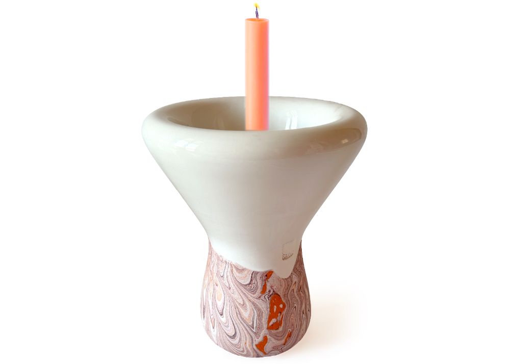 VCH-RW - At once a vase and a candle or fragrance holder, Fluid sits at the intersection of design and craftsmanship. Made using the traditional slip-casting of white earthenware in plaster molds, its rounded form draws inspiration from the ancient gestures of marbling, highlighting both the fluidity of the decoration and the porous nature of ceramics. The tonal green patterns on terracotta are created through a marbling technique, using water-based pigments with an algae solution, alternated with areas glazed in a glossy transparent finish. Each piece is unique, with natural variations occurring within the decorative family shown.