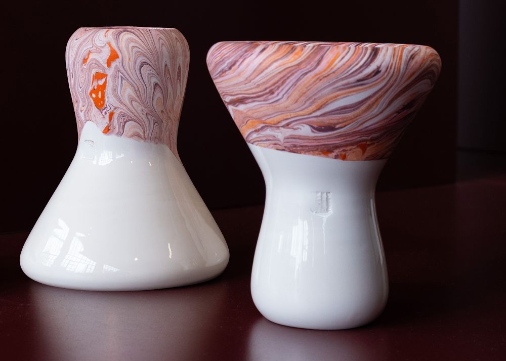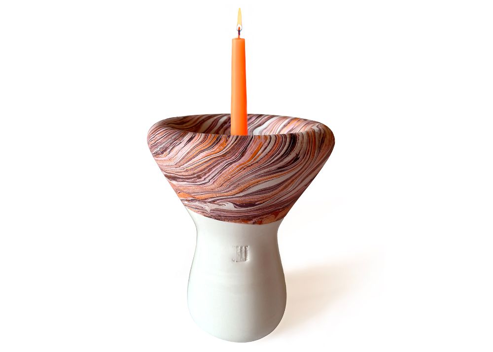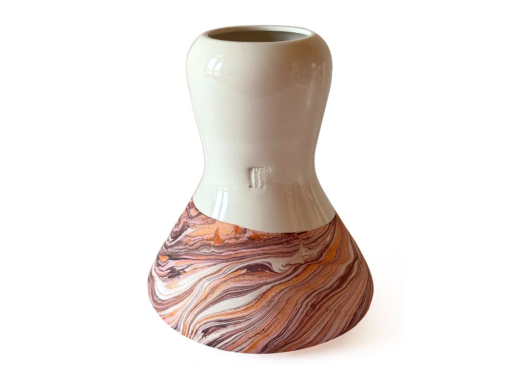 VCH-RL - At once a vase and a candle or fragrance holder, Fluid sits at the intersection of design and craftsmanship. Made using the traditional slip-casting of white earthenware in plaster molds, its rounded form draws inspiration from the ancient gestures of marbling, highlighting both the fluidity of the decoration and the porous nature of ceramics. The tonal green patterns on terracotta are created through a marbling technique, using water-based pigments with an algae solution, alternated with areas glazed in a glossy transparent finish. Each piece is unique, with natural variations occurring within the decorative family shown.
