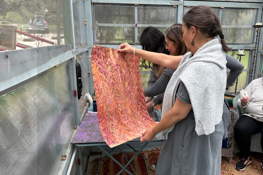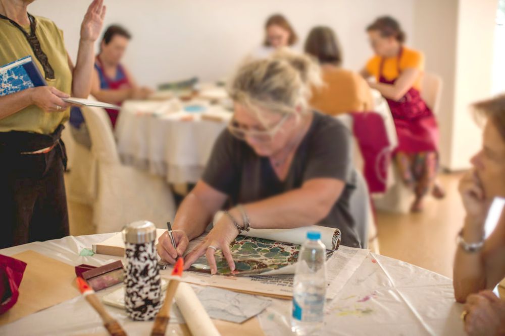 Proponiamo l'esperienza di lezioni pratiche sulla marmorizzazione ( antica tecnica di decorazione della carta ) come momento di aggregazione tra i componenti di un gruppo, di un'azienda, di un team. Anche se ogni partecipante sarà seguito individualmente durante l'esperienza pratica, il resto del gruppo rimarrà sempre presente e potrà partecipare con interventi diretti così da imparare guardando, ascoltando, suggerendo. Si tratta di un momento anche rilassante dove protagoniste sono soprattutto più le mani che la mente. Essendo anche un procedimento piuttosto veloce, il protagonista completa, in un lasso di tempo piuttosto breve, l'ideazione del progetto, il suo svolgimento e la sua realizzazione con un risultato di grande soddisfazione. Adatto a tutte le età, anche per chi non ha particolare manualità e dove non ci sono regole sostanziali, questo procedimento magico lascia spazio al proprio desiderio di mettersi in gioco, senza giudizio. Al termine di ogni esperienza individuale il gruppo sarà poi seguito nella creazione di un'opera collettiva che vede l'intervento di tutti.